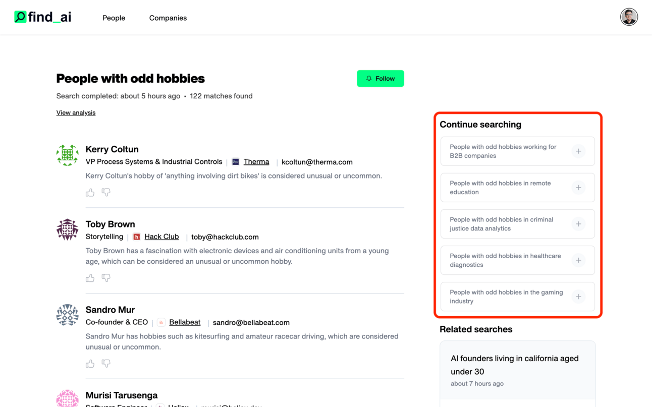 Every Find AI search now shows recommended follow-up searches. This is because every good answer inevitably leads to more questions.